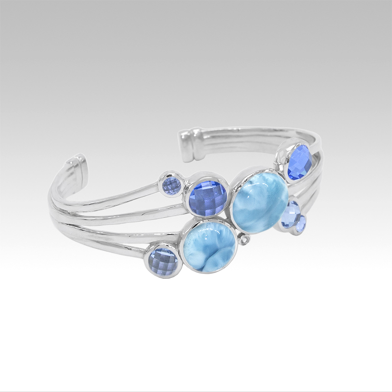 Add to your look with a gorgeous Marahlago statement piece. Marahlago uses the gem larimar in their jewelry, which is a tie to the beach in itself: larimar is only found in the Dominican Republic and is so delicate that it must be mined by hand during the seven months preceding hurricane season. If the look is more casual, swap out your Yael necklace for this beautiful Marahlago larimar cuff.