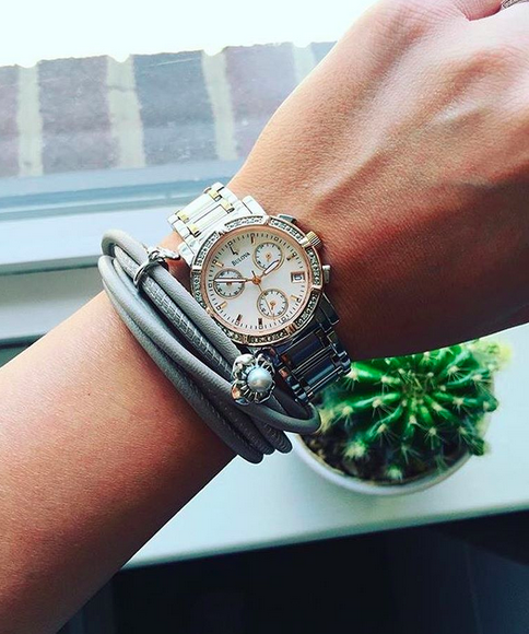 The watch makes it clear that you didn’t actually think you were going to a tailgate, while the Endless bracelet keeps the look fun. Pair this with a dainty pendant necklace (how perfect is this one from Gabriel and Co?!) to complete the look.