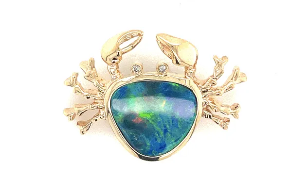 Opals are like miniature masterpieces of the sea, captivating with their kaleidoscope of colors. Our 14K yellow gold Australian opal crab pin is a stunning example of how opals can add an enchanting touch to nautical jewelry. With its vibrant play of colors reminiscent of the ocean's iridescence, this pin is a statement piece that will draw admiring glances wherever you go. Embrace the mystery and allure of opals with this mesmerizing crab pin that beautifully captures the spirit of the sea.