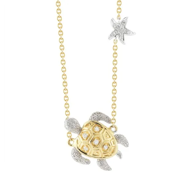 For those who appreciate symbolism and adore graceful marine creatures, our 14K yellow and white gold diamond turtle necklace is an ideal choice. Turtles symbolize endurance, longevity, and wisdom in many cultures. This necklace not only exudes elegance but also holds a deeper meaning, making it a thoughtful gift for someone special. Whether you wear it as a reminder of your own strength or as a token of friendship, this exquisite necklace will be cherished by all who value the wisdom of the sea.