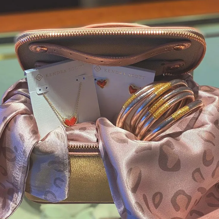 Straight from our boutique’s new Instagram account (@little.luxuries.somd), this gift set is a great place to start. These pieces are all sold separately, meaning that you have TOTAL customizing power! This look starts with a vanity case and a few pieces of fashion jewelry, including Kendra Scott hearts and Buddha Girl bracelets.