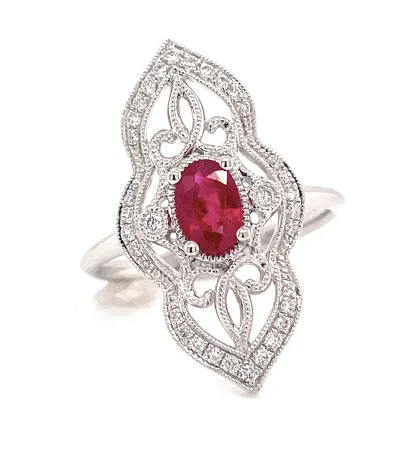 Diamonds are forever, and so is your love. This white gold filigree ring is studded with gorgeous diamonds. A red ruby in the center makes this piece unique. Perfect for a proposal or just a way to say, “I love you!”