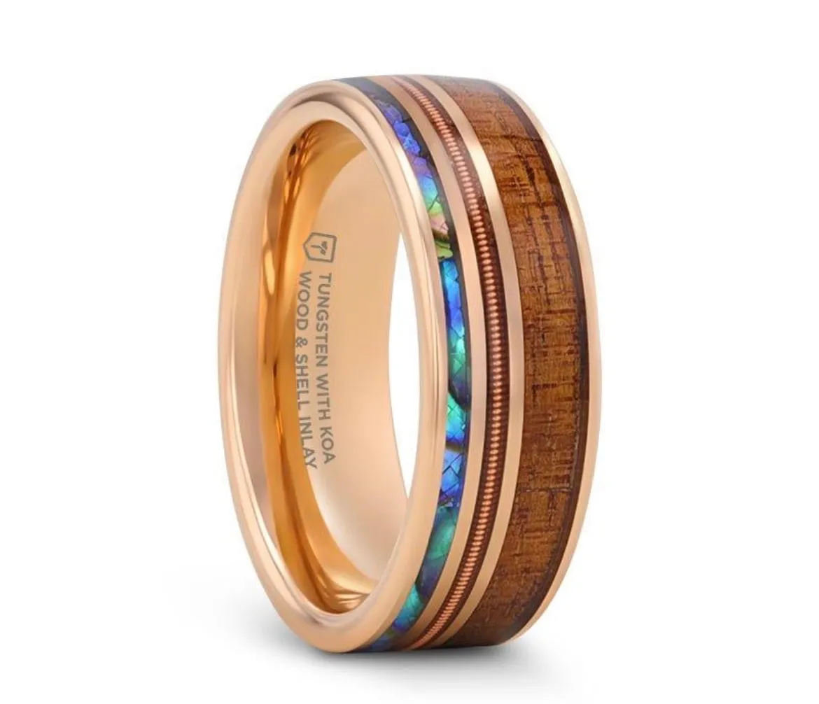 Holiday money is the perfect excuse to upgrade something you wear often. For men who appreciate unique design, the Moana 8mm Smoked Rose Gold Tungsten Ring with Hawaiian Koa Wood, Abalone, and Guitar String is a striking choice. This band is bold without being overwhelming, and it blends natural materials with modern craftsmanship. The combination of koa wood and abalone creates depth and texture, while the guitar string detail adds an artistic touch. Whether you wear it daily or save it for special occasions, it is a meaningful piece that stands out.
