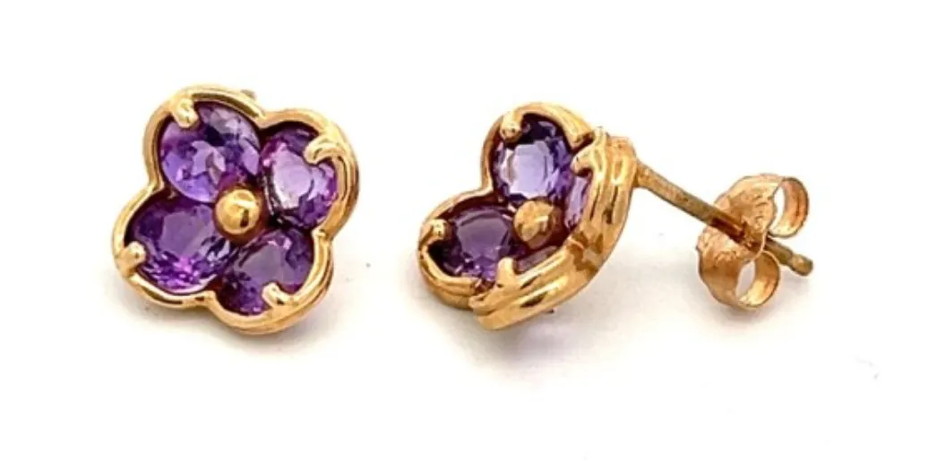 Estate 14kt Yellow Gold Round Amethyst Flower Post Earrings
