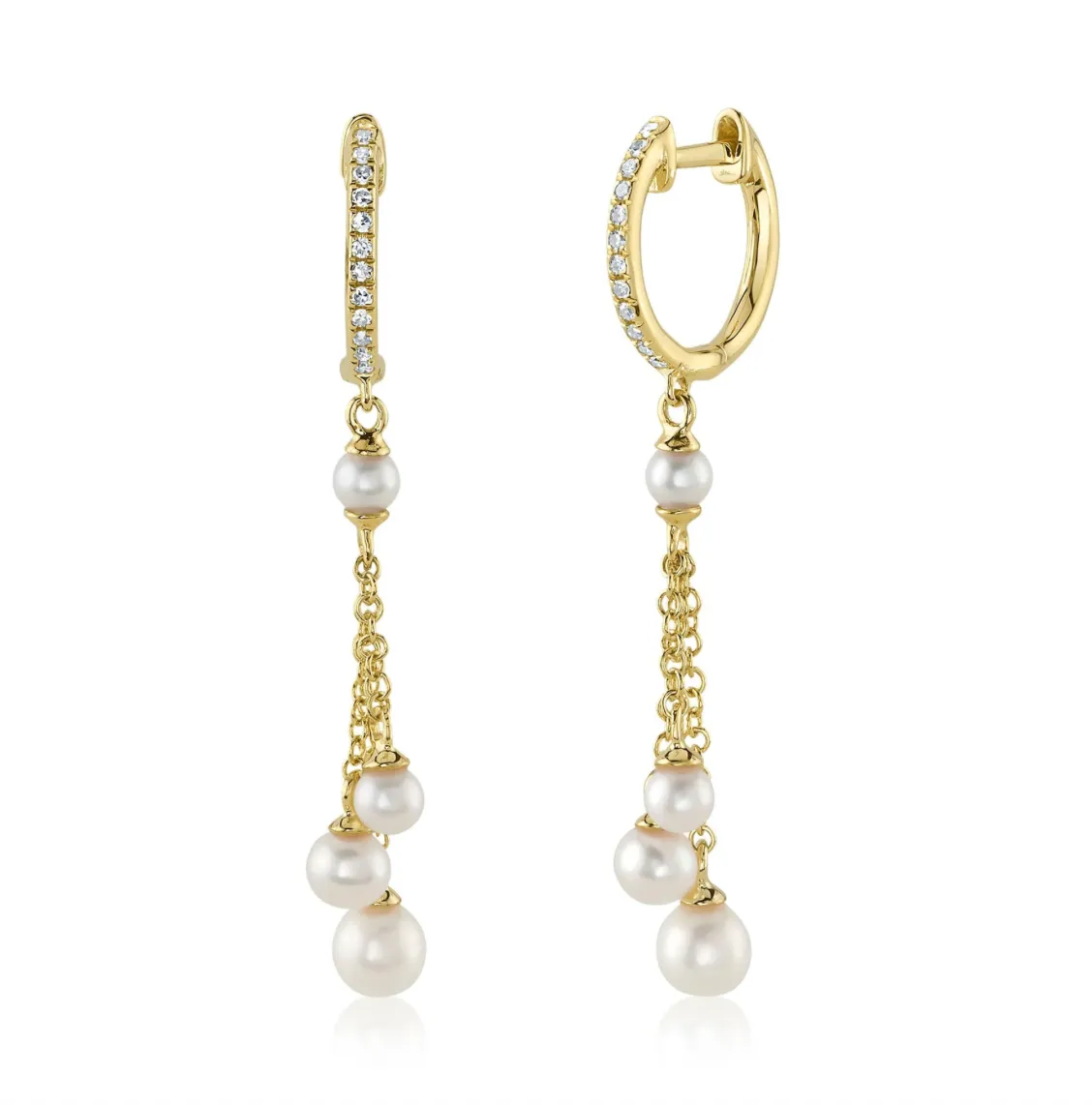 This month, we’re highlighting a show-stopping pair of pearl earrings that perfectly captures the elegance and movement pearls are known for. Our 14kt yellow gold cultured pearl 3-drop tassel huggie hoop earrings are a modern twist on a timeless classic. Delicate strands of luminous pearls dangle from sleek yellow gold hoops, offering a graceful sway with every step.
