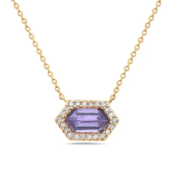 This hexagonal amethyst necklace is a perfect way to incorporate February’s birthstone into your wardrobe. This necklace demonstrates amethyst’s lighter shades and looks stunning with the yellow gold chain.