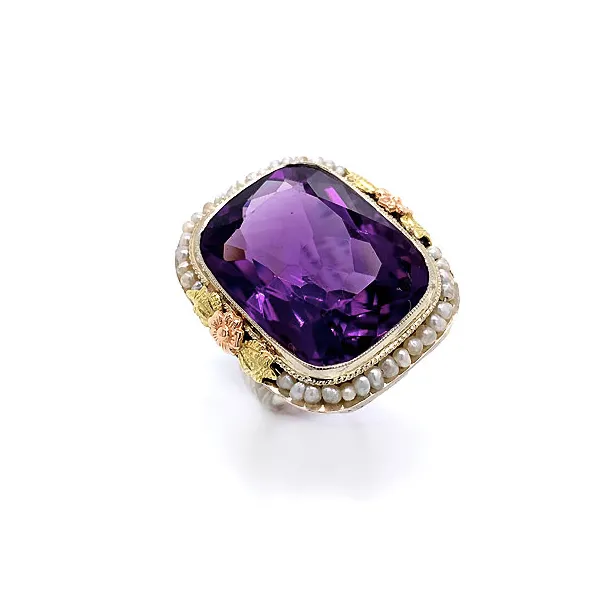 This antique and estate ring is a great example of a darker amethyst. Surrounded by white gold and seed pearls, this ring will definitely make you feel like royalty!