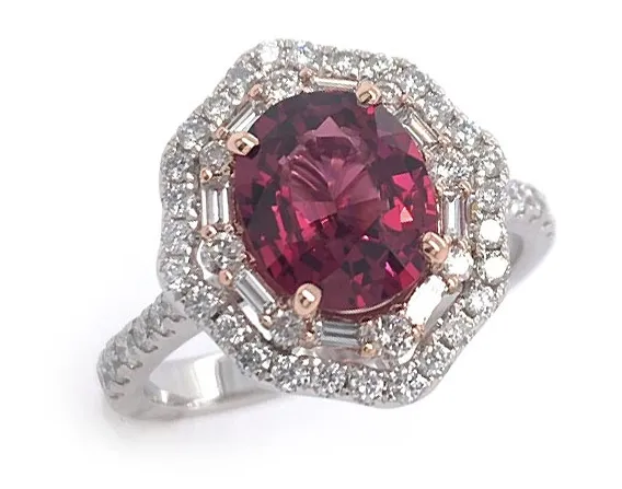 Spinel is the lesser-known of the two birthstones, which is a shame because it is beautiful. Spinel comes in many different colors, including red. This halo ring is a great example!