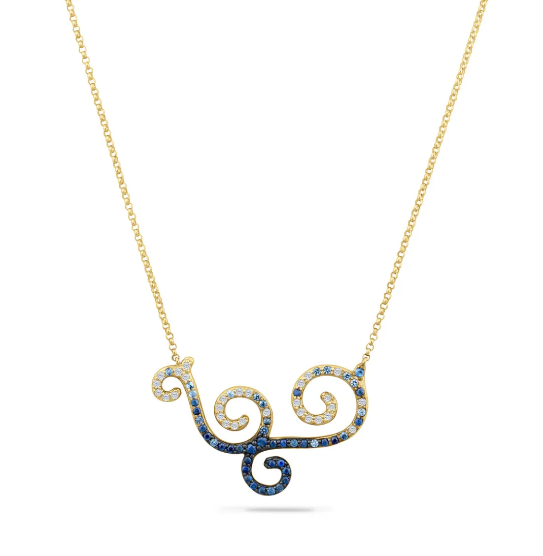 This necklace is a perfect balance of elegance and movement. The wave design creates a graceful silhouette while diamonds add brilliance to the rich blue sapphires. It is a versatile piece that can be worn every day or saved for special occasions.
