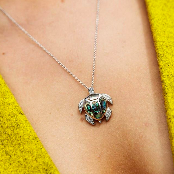 How much do we love this abalone sea turtle pendant? It’s that perfect subtle summer nod. The pearlescent shell conjures up images of oyster shells. The white Swarovski crystals keep things fancy and footloose. We can just imagine wearing this necklace while eating a seafood feast on the boardwalk.