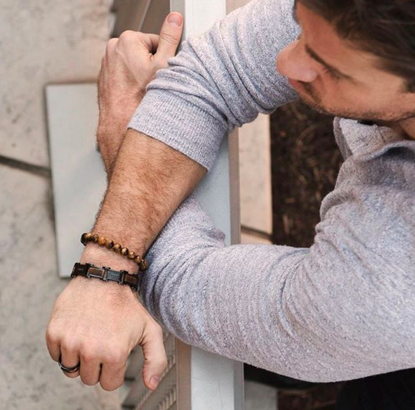 One of the trends we love most is casual jewelry for men. This bracelet combination is especially cool. We love how the wood beads play with the leather strap in this bracelet setup.