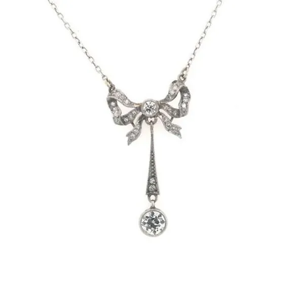Big bows are making a splash in the accessory world this season, and our antique platinum diamond bow necklace is a stunning example of this trend. With its vintage-inspired design and sparkling diamonds, this necklace adds a touch of old-world glamour to any look. Whether you wear it with a casual outfit to add a pop of elegance or save it for special occasions, this necklace is sure to become a treasured heirloom for years to come.
