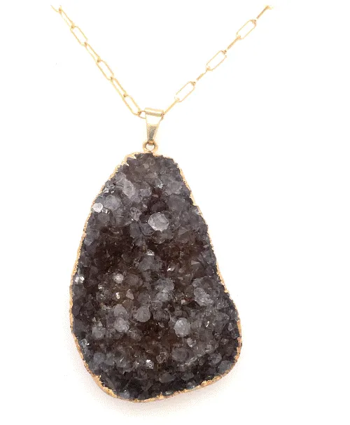 Puffy sleeves are super trendy yet still intimidating to many. They can be styled so many different ways! It’s hard to give one definitive jewelry look because puffy sleeves have so many looks of their own: prairie girl, edgy, professional. Generally speaking, you’ll want to match your jewelry to the tone of your outfit — no formal, traditional pearl necklaces with your flowy cowgirl top, for example. That being said, consider trying something new if you’re already stepping outside your comfort zone! Check out this SUPER sparkly geode-inspired necklace.